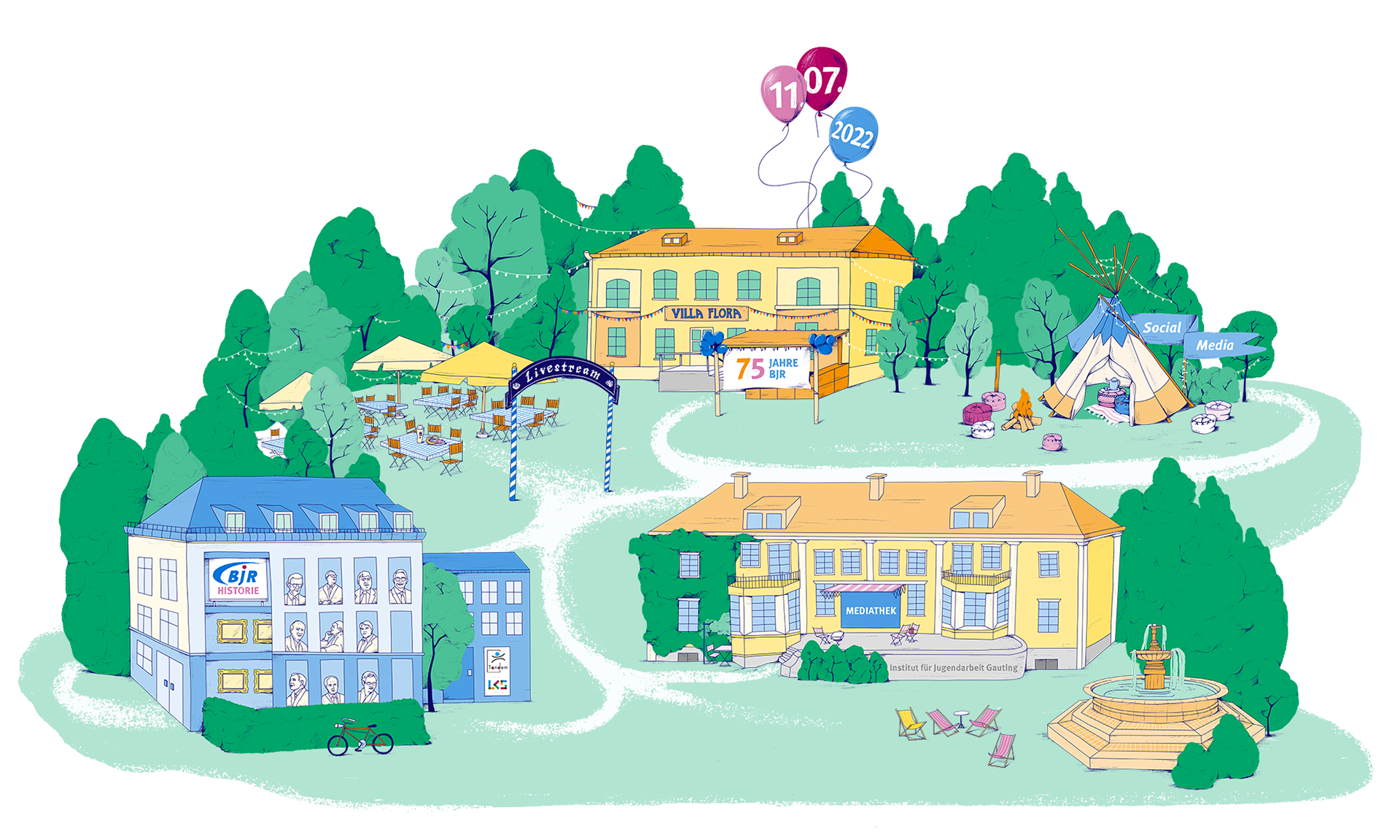 Illustrations for the 75th anniversary of the Bayerischer Jugendring. In an imaginative village, various stations around the event can be discovered. On this occasion all past and the current president should be portrayed.